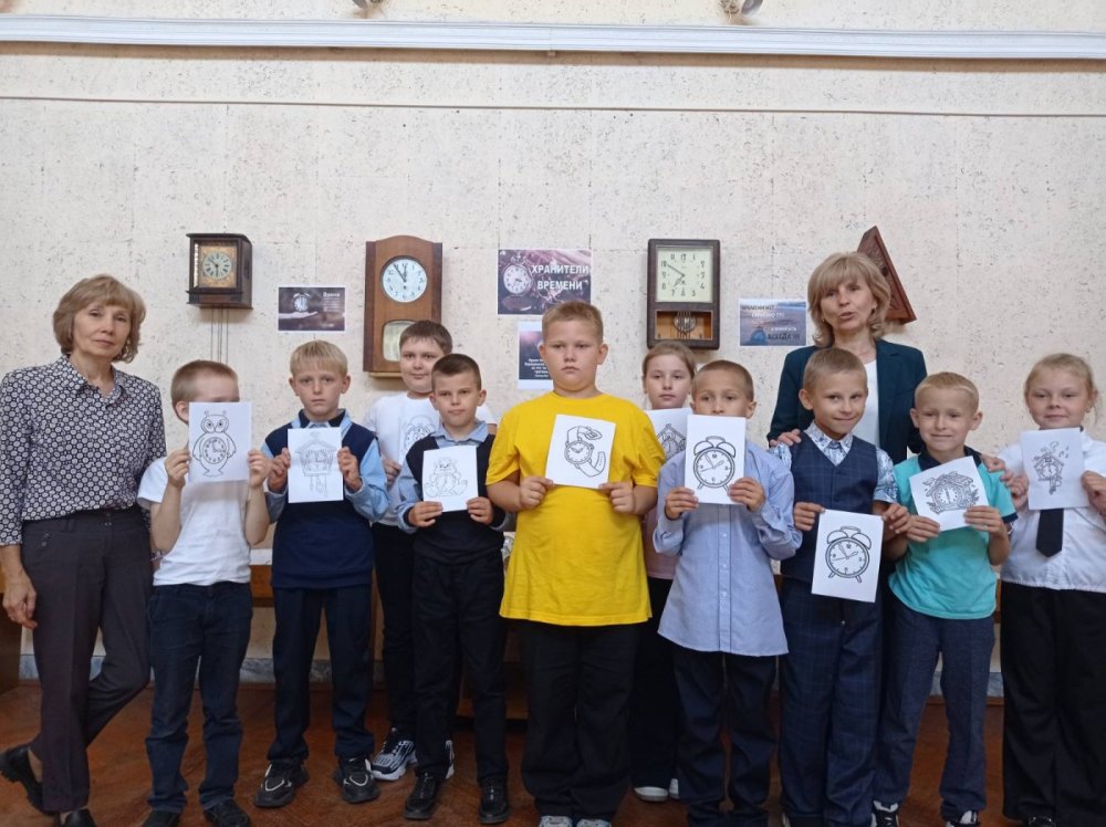 11 сентября для учащихся 3-го класса ГУО "Средняя школа № 2 г. Костюковичи" сотрудники музея провели занятие с элементами игры "Кто жить умеет по часам". В ходе занятия ребята познакомились с историей часов, их разнообразием - от "живых" часов до атомных. Учащиеся отгадывали загадки о времени и часах, дополняли пословицы, собирали пазлы, решали кроссворд. В конце занятия ребята посетили выставку часов из фондов музея "Хранители времени". На память о посещении выставки сотрудники музея подарили детям раскраски с изображением часов.